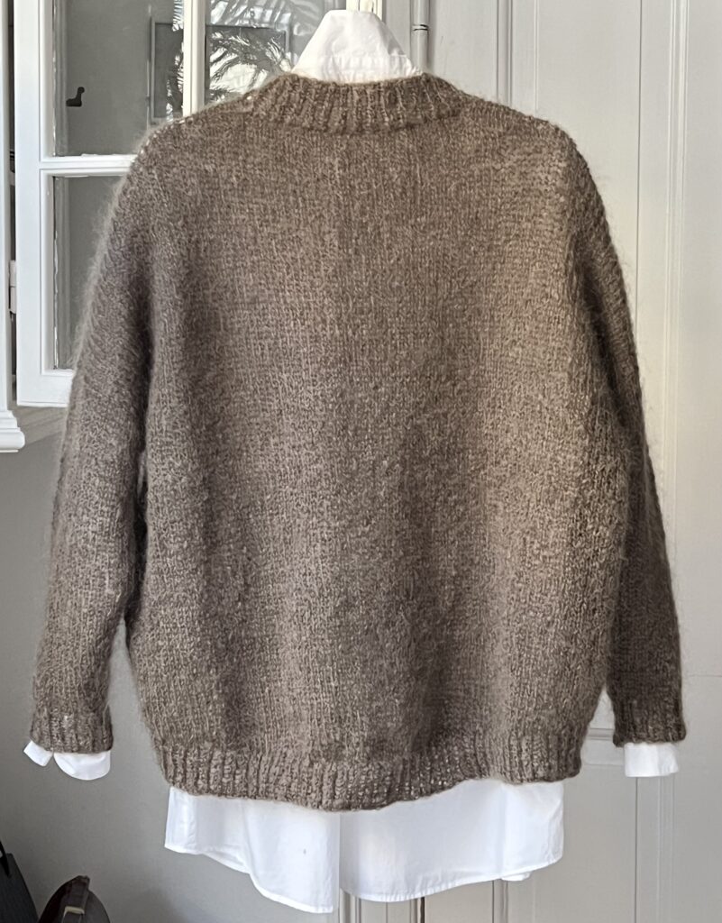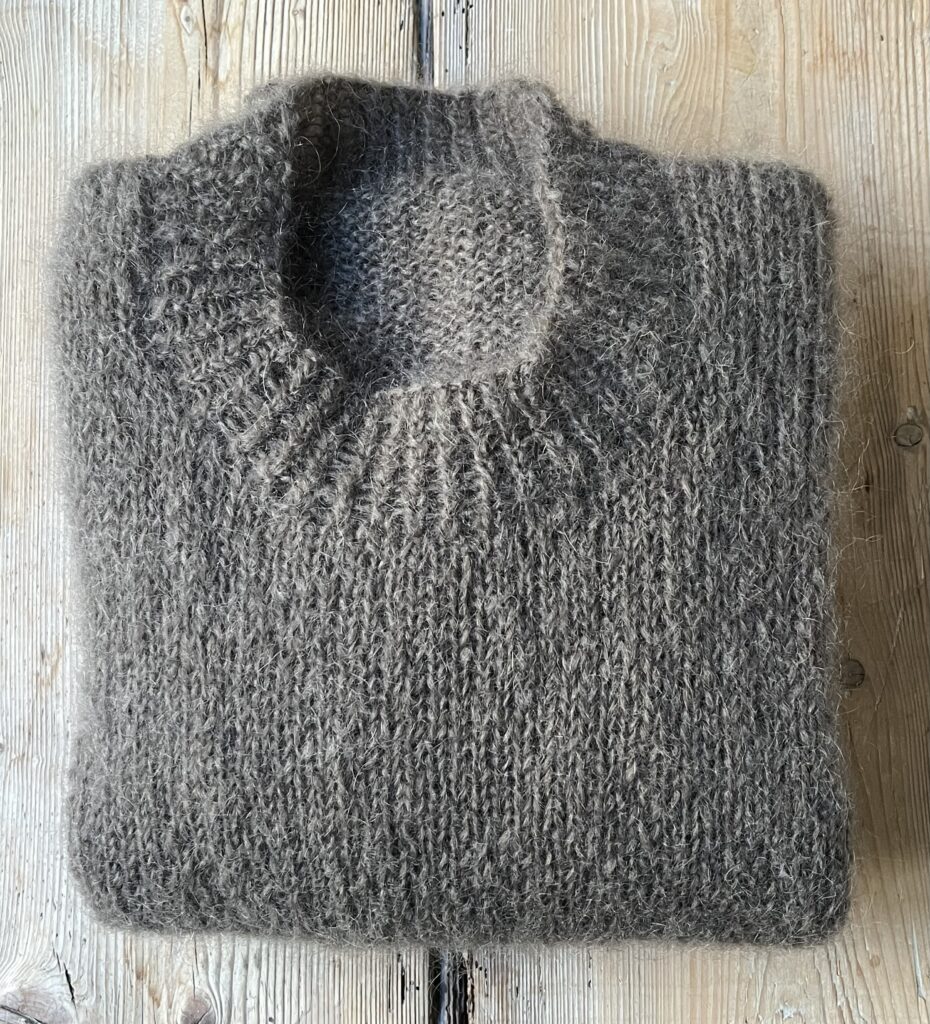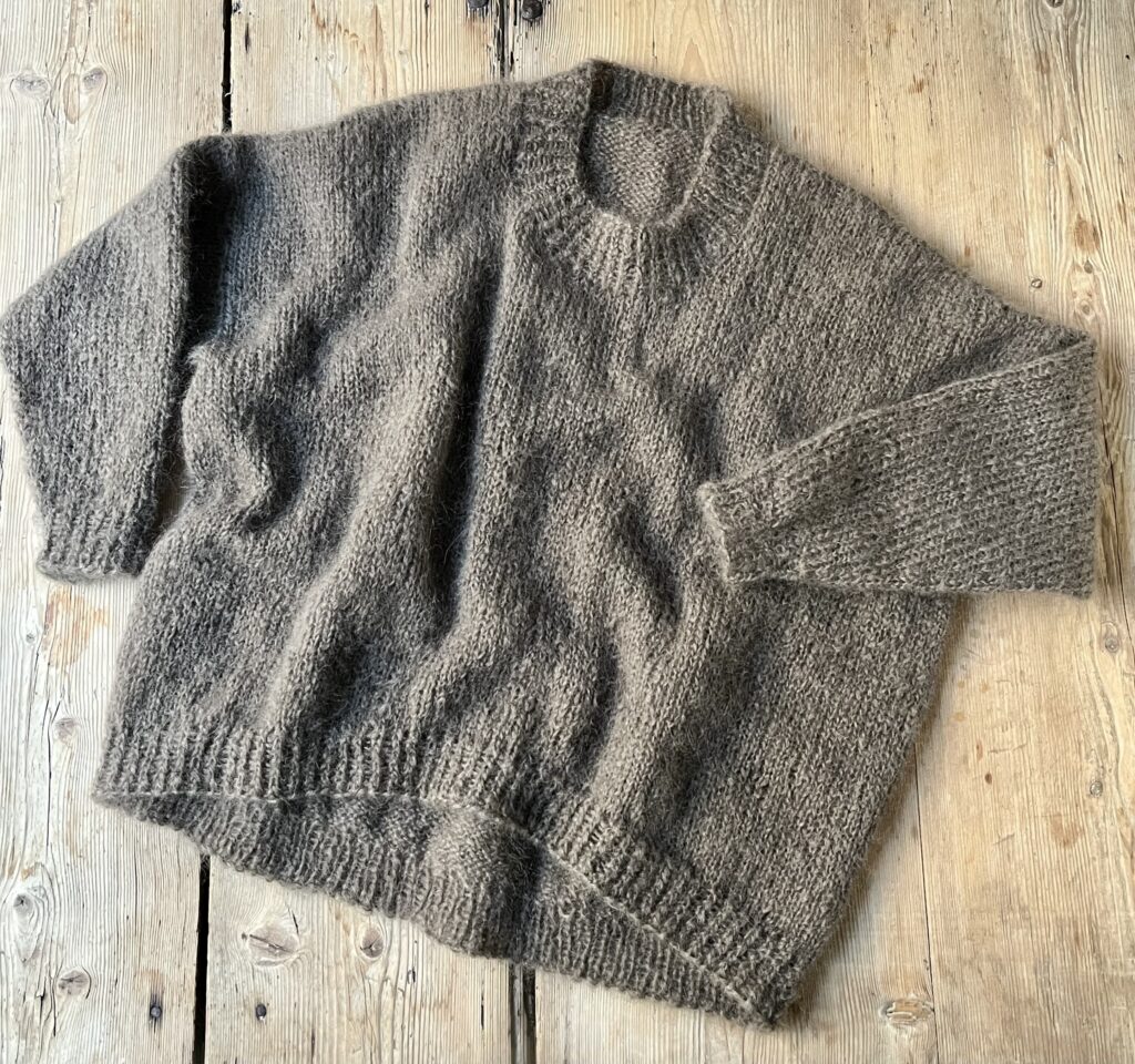 Uh – jeg har altid elsket store hyggelige sweatre, som både kan bruges over kjole og bukser, og jeg indrømmer gerne, at den her bløde og fluffy mohairbamse er en favorit. Der er absolut ingen dikkedarer ved designet, bortset fra at sweateren er længere bagpå end foran, og det opnår du med vendepinde.
