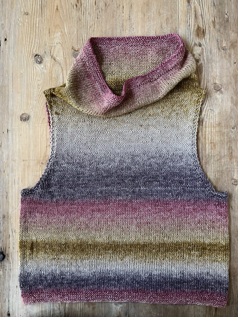 Toppen strikkes nedefra og op og rundt op til ærmegabet.