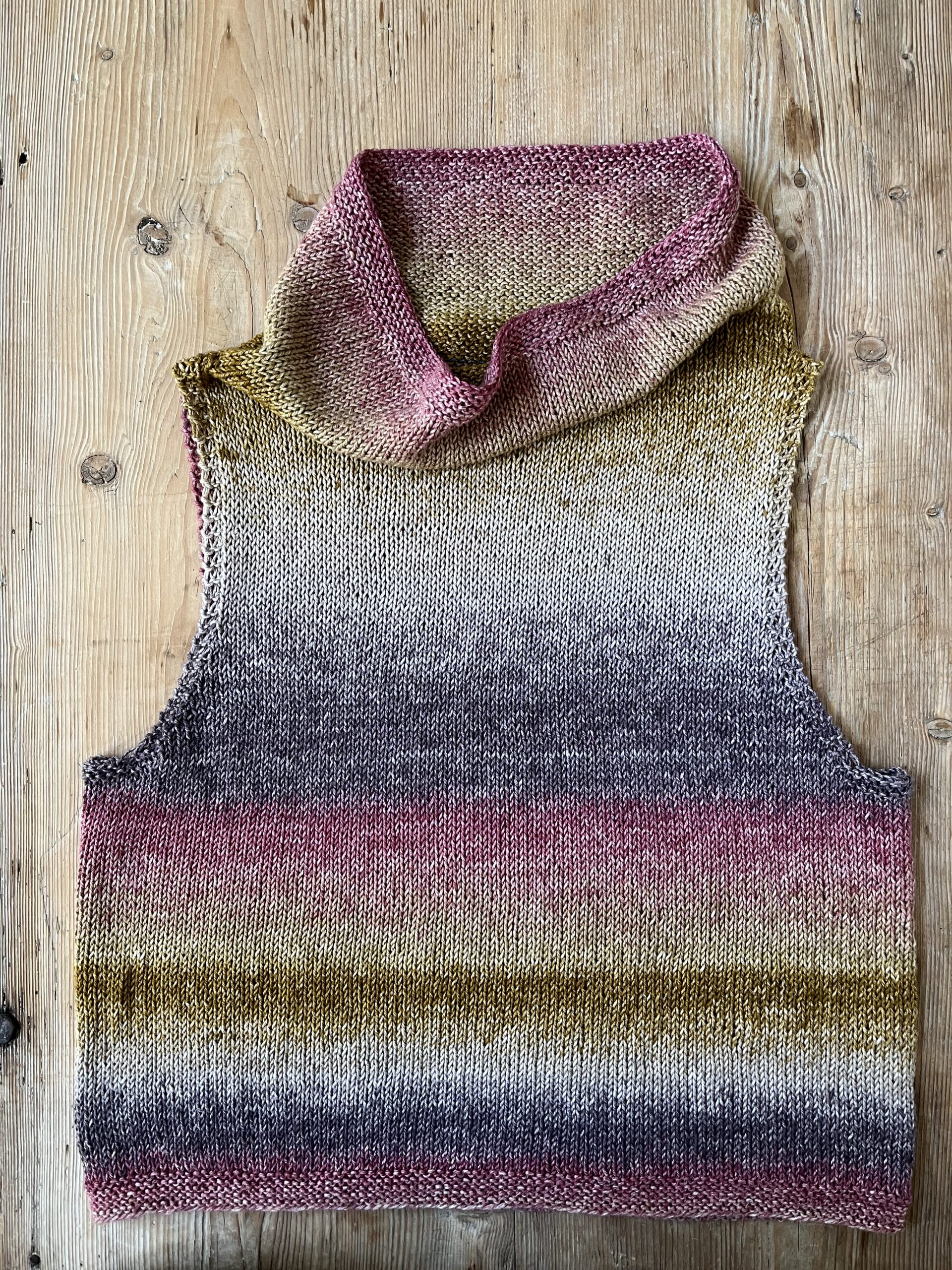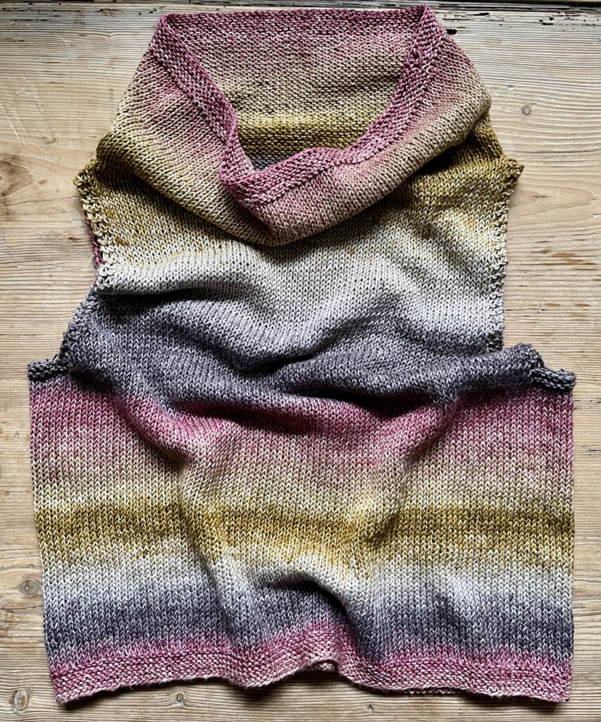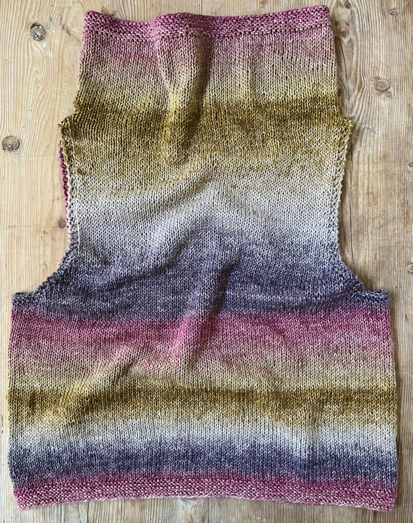 Fortsæt lige op, til hele toppen måler 43-44-45-46 cm. Luk af for de 3 kantm i hver side, og sæt de resterende m på en strikkewire til halskant.