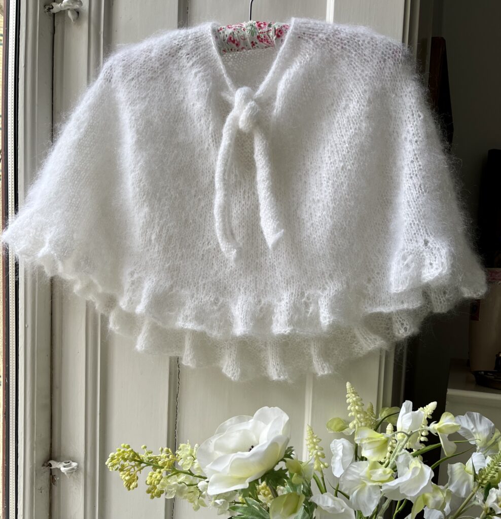 Blød og hvid som en sky. Den lille feminine poncho er perfekt over konfirmations- eller studenteroutfittet i det lunefulde forårsvejr – og over både hverdags- og festtøjet resten af året. Her er den strikket i hvid som en lammesky, men vælger du en af de mange skønne farver, som det bløde mohairgarn Bella fås i, kan du give den et helt andet udtryk.